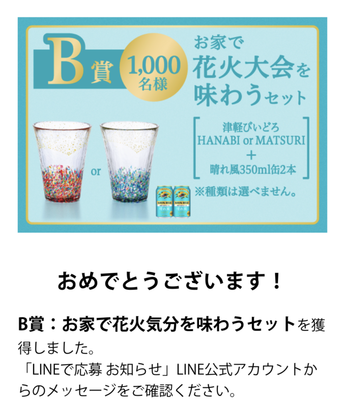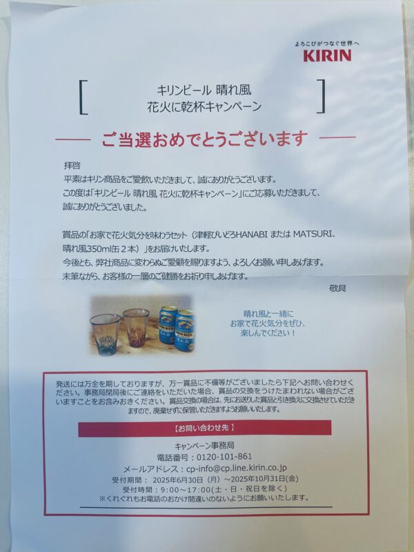 【当選報告】KIRIN キリンビール 晴れ風花火に乾杯キャンペーン
