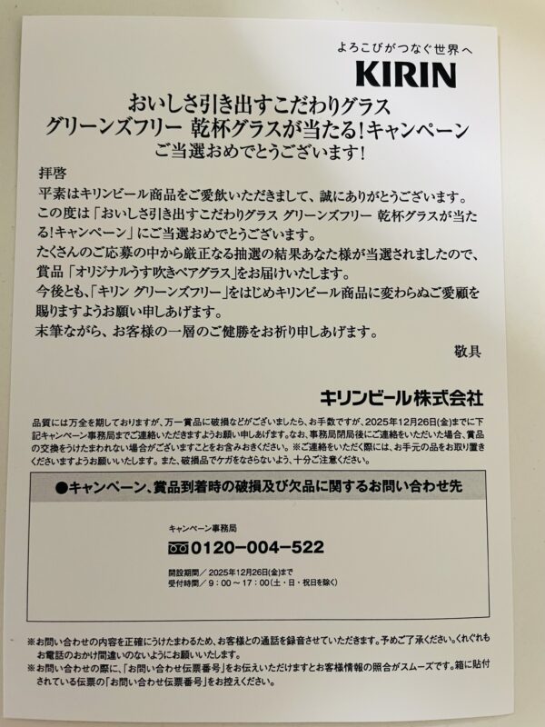 【当選報告】キリンビール グリーンズフリー 乾杯グラスが当たる!キャンペーン
