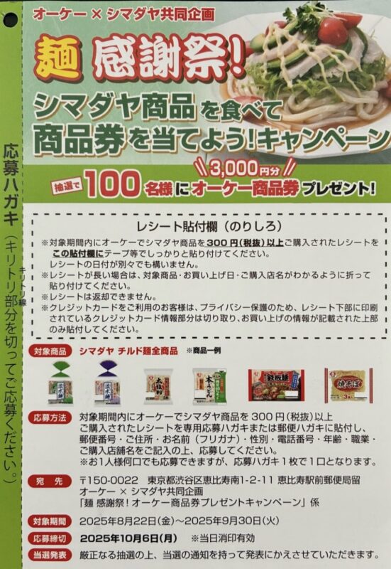 【当選報告】オーケー×シマダヤ 秋の麺感謝祭!シマダヤ商品を食べて商品券を当てよう!キャンペーン