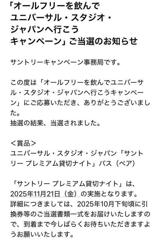 【当選報告】サントリー オールフリーを飲んでユニバーサルスタジオジャパンに行こう!キャンペーン